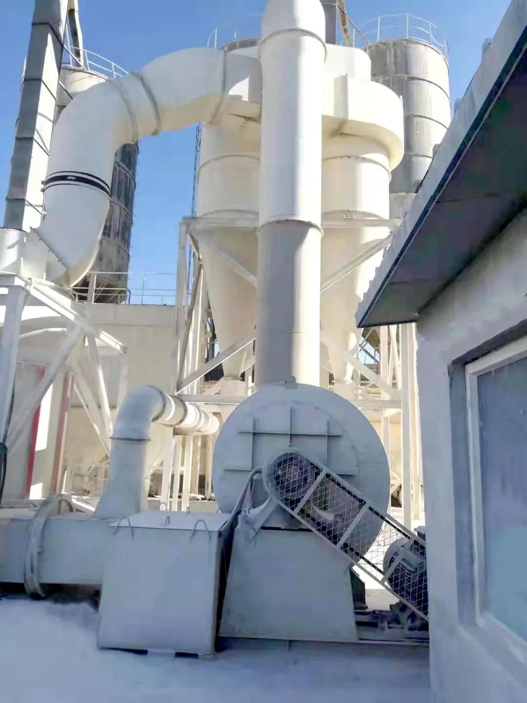 主要創新點一:優化鏟刀座傾角,調整鏟刀高度,提高生產產量10%以上;主機罩筒與回氣箱采用軟連接,磨輥裝置與梅花架間采用新型緩沖減震結構連接,提高了設備運行的平穩性和安全性;采用組合式襯板,減少維護成本和時間;采用主軸下支承裝置臺階孔式軸承壓蓋的密封機構,提高密封的可靠性,維護更方便;管道系統處在負壓狀態下工作,雙旋風收集器下部出粉口裝有鎖氣閥,粉體收集效率提高了10%以上;余風口配備了脈沖除塵器,排放粉塵的收集效率高達99.9%。